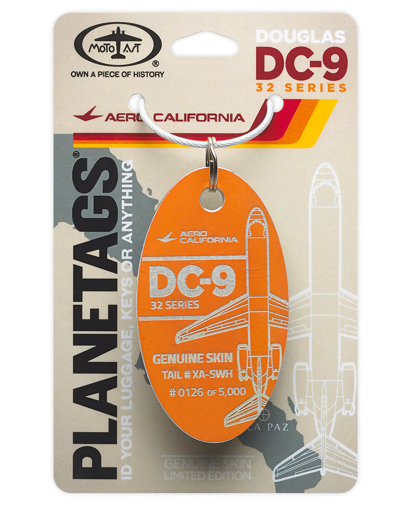 The newest PlaneTags are here - a McDonnell Douglas DC-9-32, resplendent in the vintage Aero California livery. The rich yellow, orange, red, and wine colors were intended to evoke images of sunny Baja California Sur, the home of the airlines' headquarters in La Paz, Mexico from 1960 - 2008.